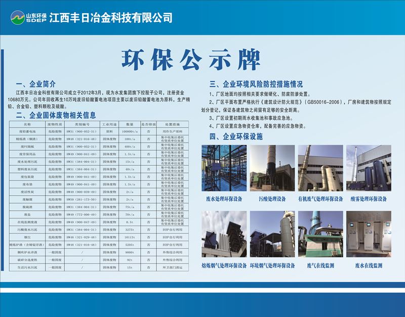 江西豐日冶金科技有限公司成立于2012年3月,注冊資金15000萬元,現(xiàn)為山東環(huán)保集團(tuán)旗下控股子公司,落戶于江西省宜春市袁州醫(yī)藥工業(yè)園。公司年回收再生十萬噸廢舊鉛酸蓄電池項目占地62.41畝,總建筑面積42180㎡,總投資3.5億元,于2020年5月份投入生產(chǎn),自生產(chǎn)以來運行穩(wěn)定,年產(chǎn)值達(dá)10億元以上,年納稅1億元以上。